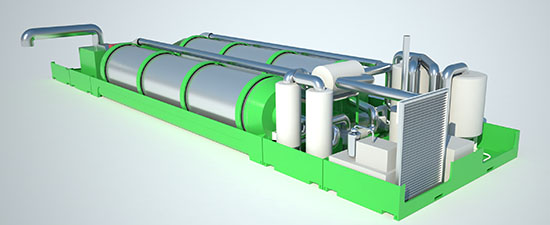 | Structure: | Modular intermodal shipping container-fitted treatment plant including following units: waste mixer and feeder, kiln 1, kiln 2, buffer storage for the end product, device room, cleaning unit and control room |